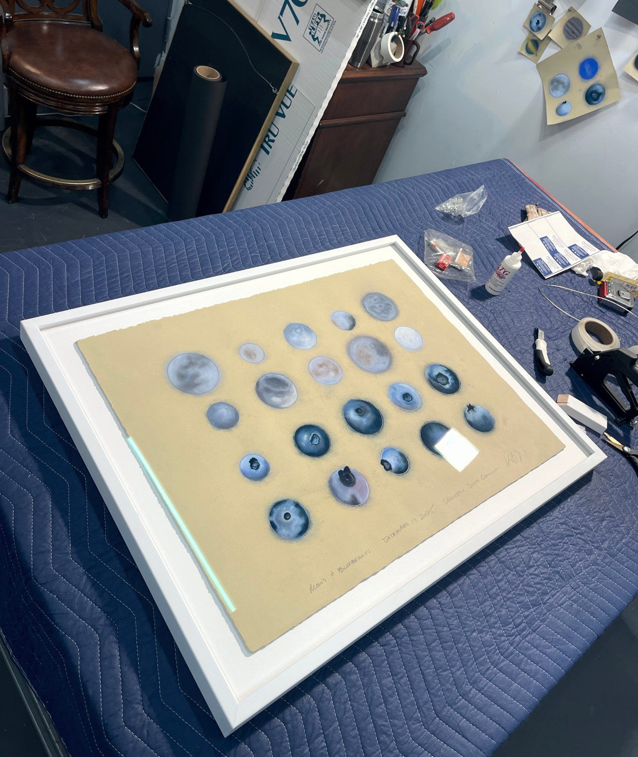 "At some point during all the art fairs in the last year, I realized that it's pretty common for people to confuse my blueberries with celestial bodies, moons, in particular. I can see the similarity. And so I decided to work with the idea and pair ten moons with ten blueberries."